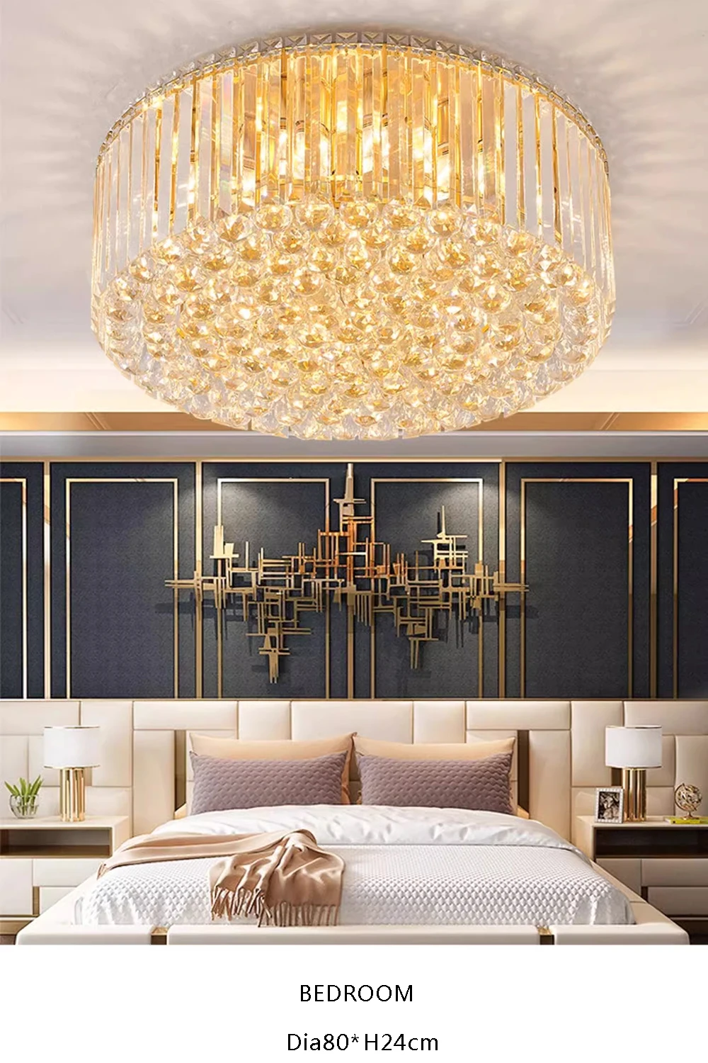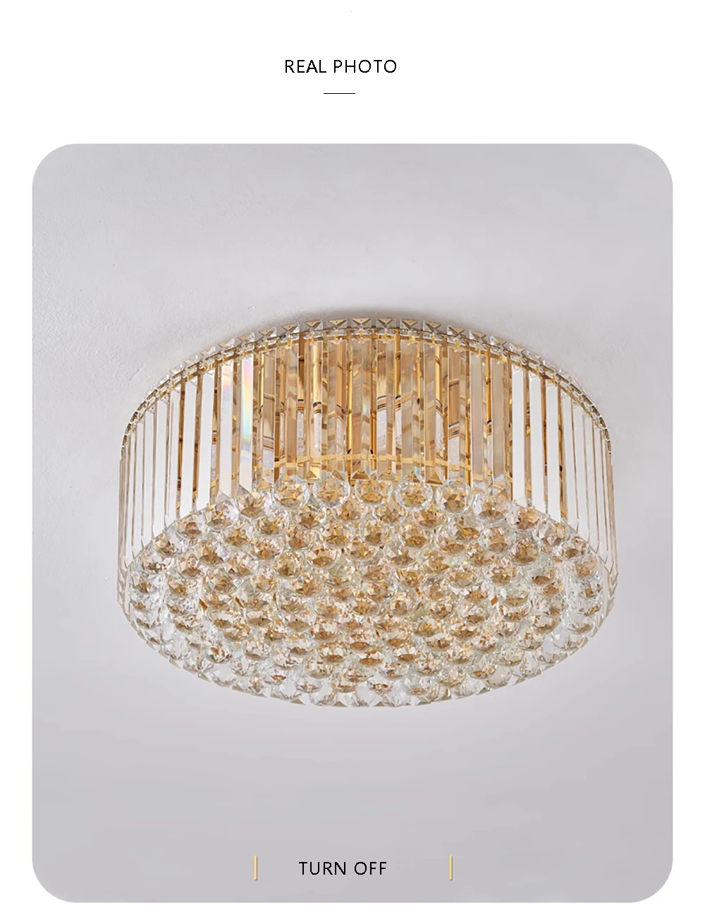 This Round Crystal Fixture combines functional lighting with decorative brilliance. Precision-cut crystals reflect light beautifully, producing a soft glow without glare. The round ceiling mount keeps the design streamlined while maintaining a luxurious presence.