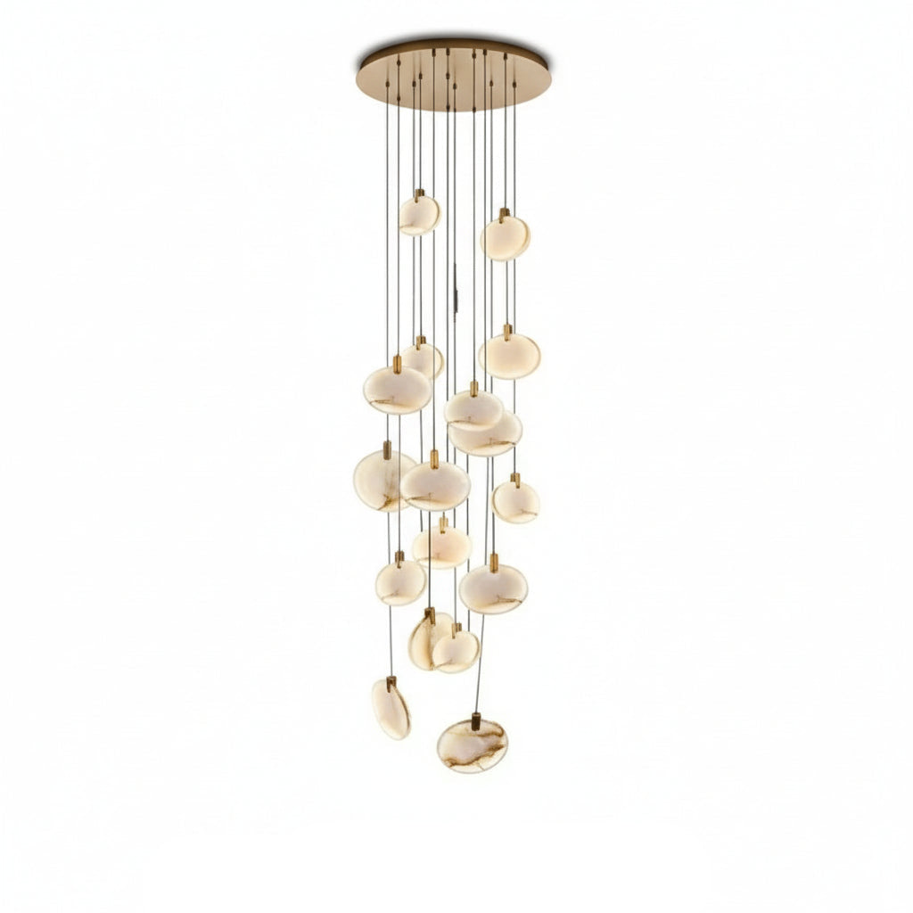 This stunning long staircase Alabaster Chandelier is perfect for customers who want luxury design, natural stone lighting and a modern architectural look. It blends art and light in one beautiful fixture.