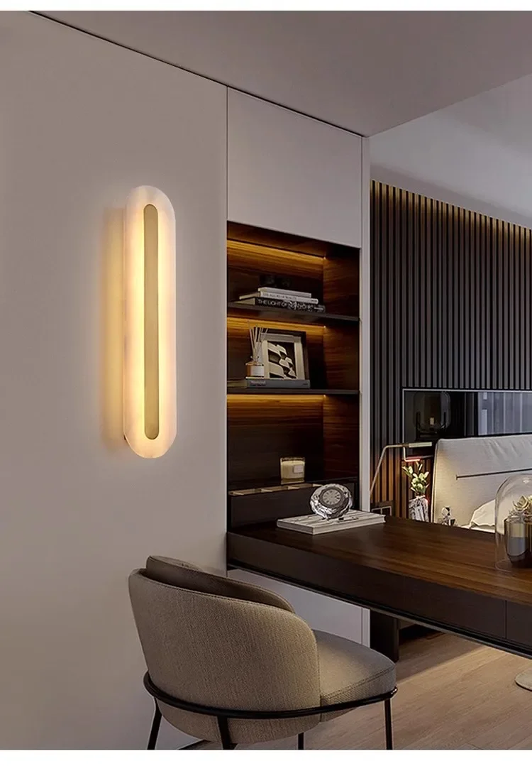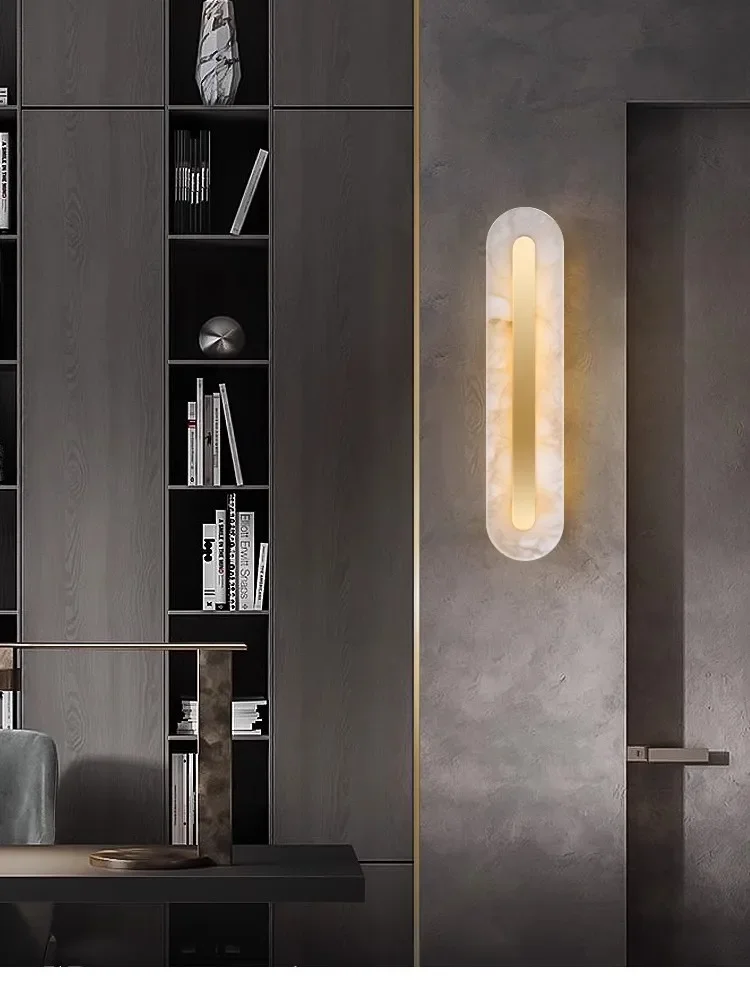 The gold marble structure adds texture and depth to interior walls. Its minimalist profile suits modern bedroom décor, contemporary homes, and boutique hotel interiors. Install this Bedroom Lamp in pairs for symmetrical bedside styling or use it as a statement accent piece.
